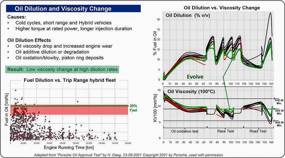 Using Evolve EvoSyn, Porsche AG conducted a “destructive engine test” on the latest 6 cylinder turbo engine. The target of the test was to go far beyond the areas of the ACEA testing methodology for oil approvals. The test was extensive and more than 600 hours in duration. It was conducted under extreme and severe operating conditions designed to find the break point for the engine and lubricant. The test included high-performance and racetrack simulations, high piston ring groove temperatures, significant aged oil conditions, extreme cold start and high fuel dilution scenarios. Way beyond the extremes you would ever want to put your Porsche engine through.