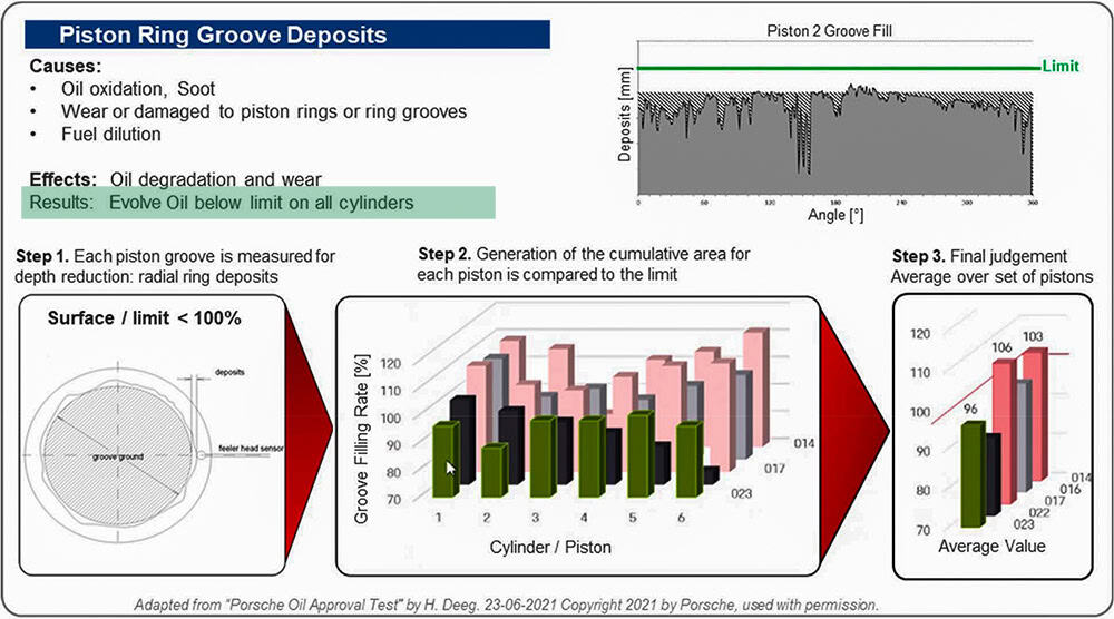 In aged oil or endurance tests such as the Porsche test above, low ring groove deposit formation is a critical indicator of an oil’s thermal stability and additive robustness through an oil change interval. Oils that resist oxidation and maintain cleanliness better protect the piston ring interface, which is key for sealing efficiency and long-term power retention in your engine.
